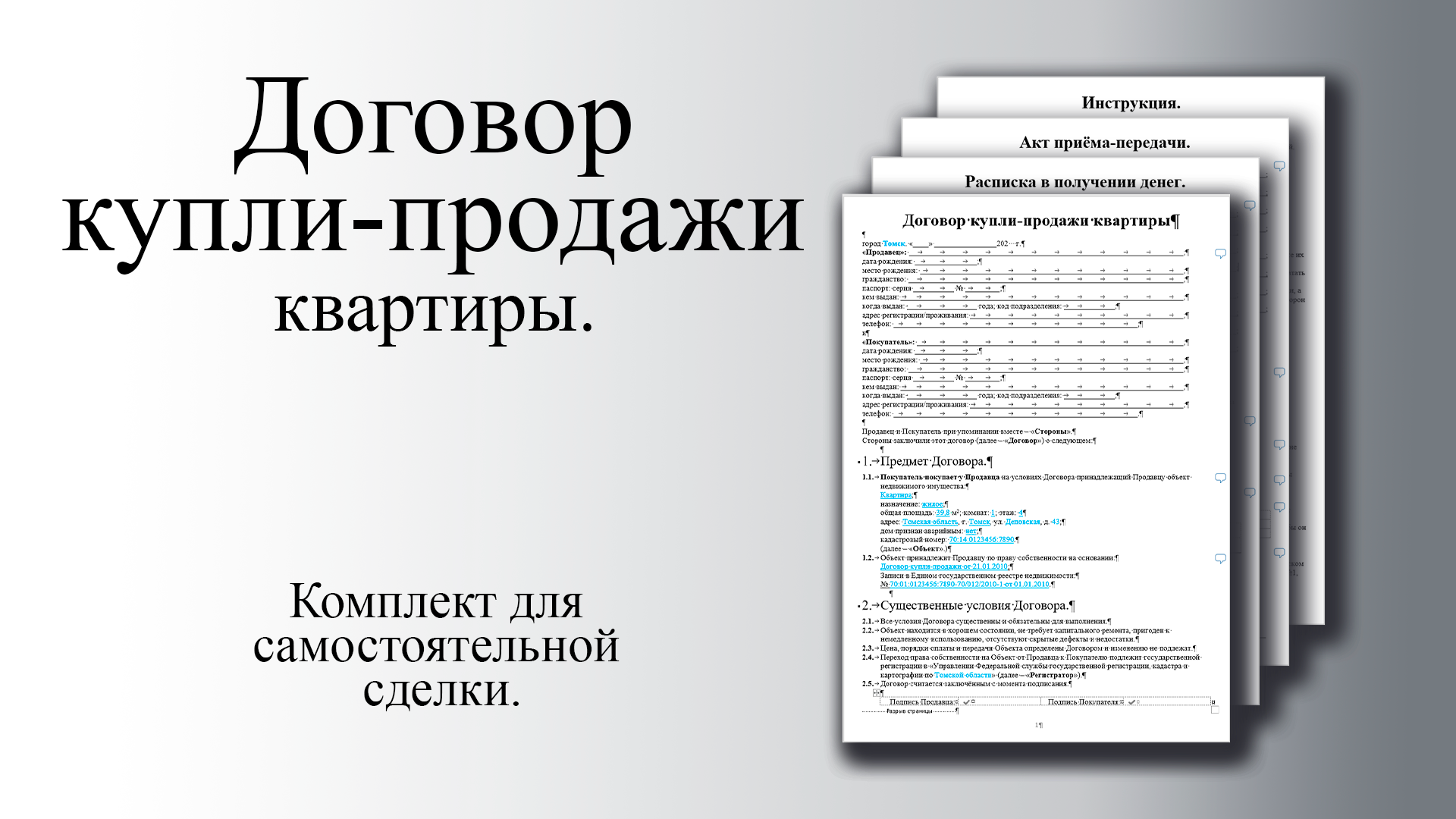 Каждый договор нужно настраивать под определённую сделку. Например, если квартиру продают супруги, то это один правовой статус собственности, а если один человек, то другой. При этом, у этого одного человека может оказаться супруг, согласие которого может понадобиться для сделки. Для разных случаев в договоре есть подсказки, которые избавят вас от раздражающих поисков информации в сети.