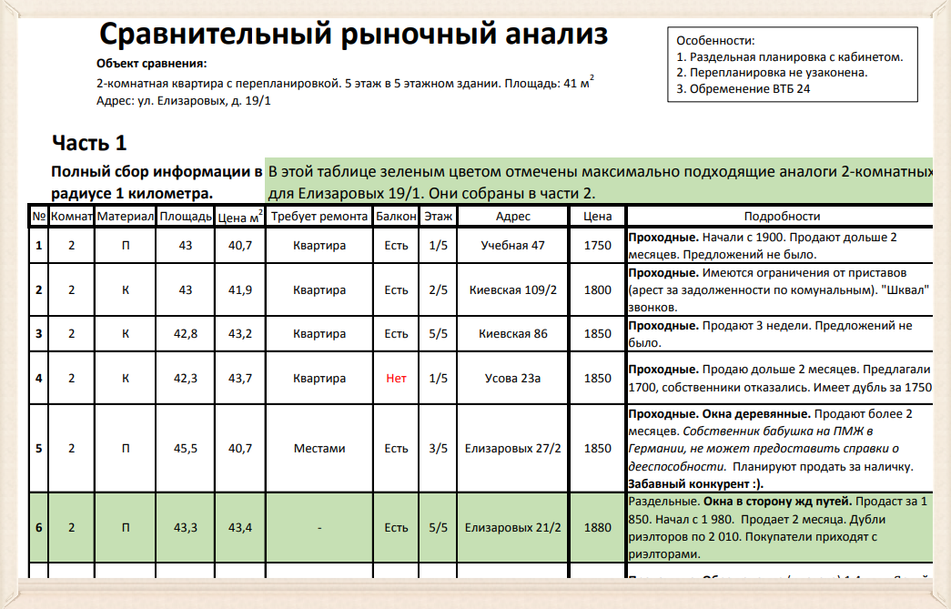 Получите подробный рыночный анализ с прозвоном и подробной фиксацией слабостей и преимуществ аналогичных объектов недвижимости и данными о проданных объектах за предыдущий квартал